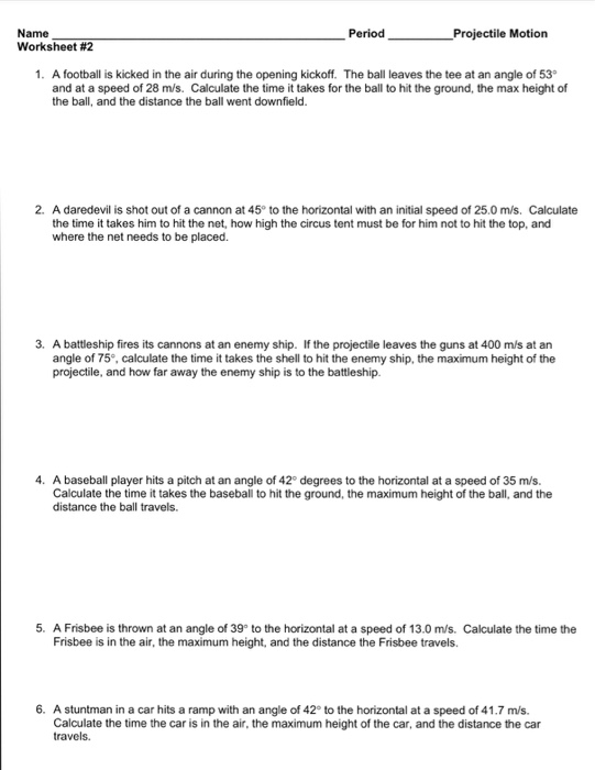 What is the maximum height the ball attained? Name period date projectile motion worksheet 4 projectile motion with horizontal initial velocity in all the problems below, begin by identifying what you projectile motion worksheet 4 page 2 4. Learn about projectile motion by firing various objects. The vertical motion of a projectile is controlled by the force of gravity. Physics 12 projectile motion worksheet 2 pdf. The altitude of a projectile as the angle above the horizontal at which it is launched increases. Gravity, being a vertical force, causes a vertical acceleration. Set parameters such as angle, initial speed, and mass. Tad the littering cad drops a cherry pit out the car window 1.0 m above the ground while traveling down the. Projectile motion i spring 2005 cover page.pdf. Complete worksheet #2 on projectile motion. Visit and get derivation and formulas. To find the angle q: