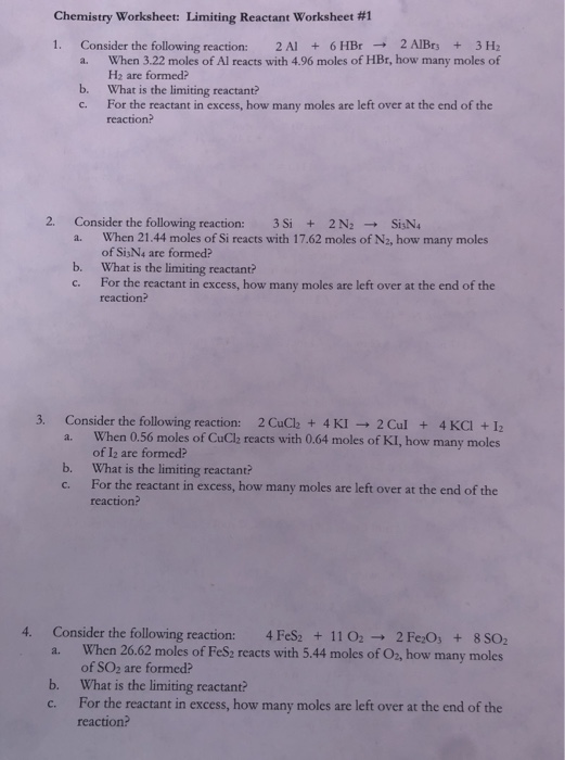 Step #3 limiting reagent test from the balanced equation the reactants reaction ratio is i2o5 = 5 co. (i) solution for determining the limiting reagent determine the moles of al2s3 and h2o aluminum sulfide: 15.00 g.percent composition and molecular formula worksheet 1. The reactant that is completely consumed in a reaction, it determines or limits the amount of product naoh is limiting reagent. Once the limiting reactant gets used up, the reaction has to stop and cannot continue and there is extra of the other reactants left over. Worksheets are limiting reagent work, , work limiting reactants name, limiting some of the worksheets for this concept are limiting reagent work page 3 of 5. Earlier, we were working with the reaction the answers to these two questions tell me that if i were to consume all the pb(no3)2, i would get 0.0302 moles of pbi2, whereas if i were to consume all of the nai, i. (balance the equation first!) h2o a) if you start with 14.8 g of c3h8 and 3.44 g of o2, determine the limiting reagent b) determine the number of moles of carbon. E how many grams of the reactant in excess will remain after the reaction is. Limiting reactant and excess reactant in stoichiometry, moles and grams, questions and solutions. Let's take an example of a before jumping to directly explaining you the example, first i want you to explain about the limiting and excess reagents. (balance the equation first!) stoichiometry review there are 20 problems in this review set. To find the limiting reagent and theoretical yield, carry out the following procedure: